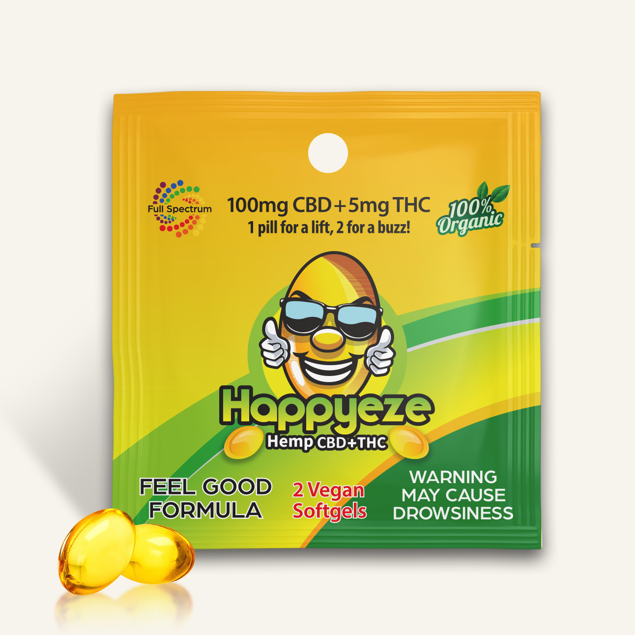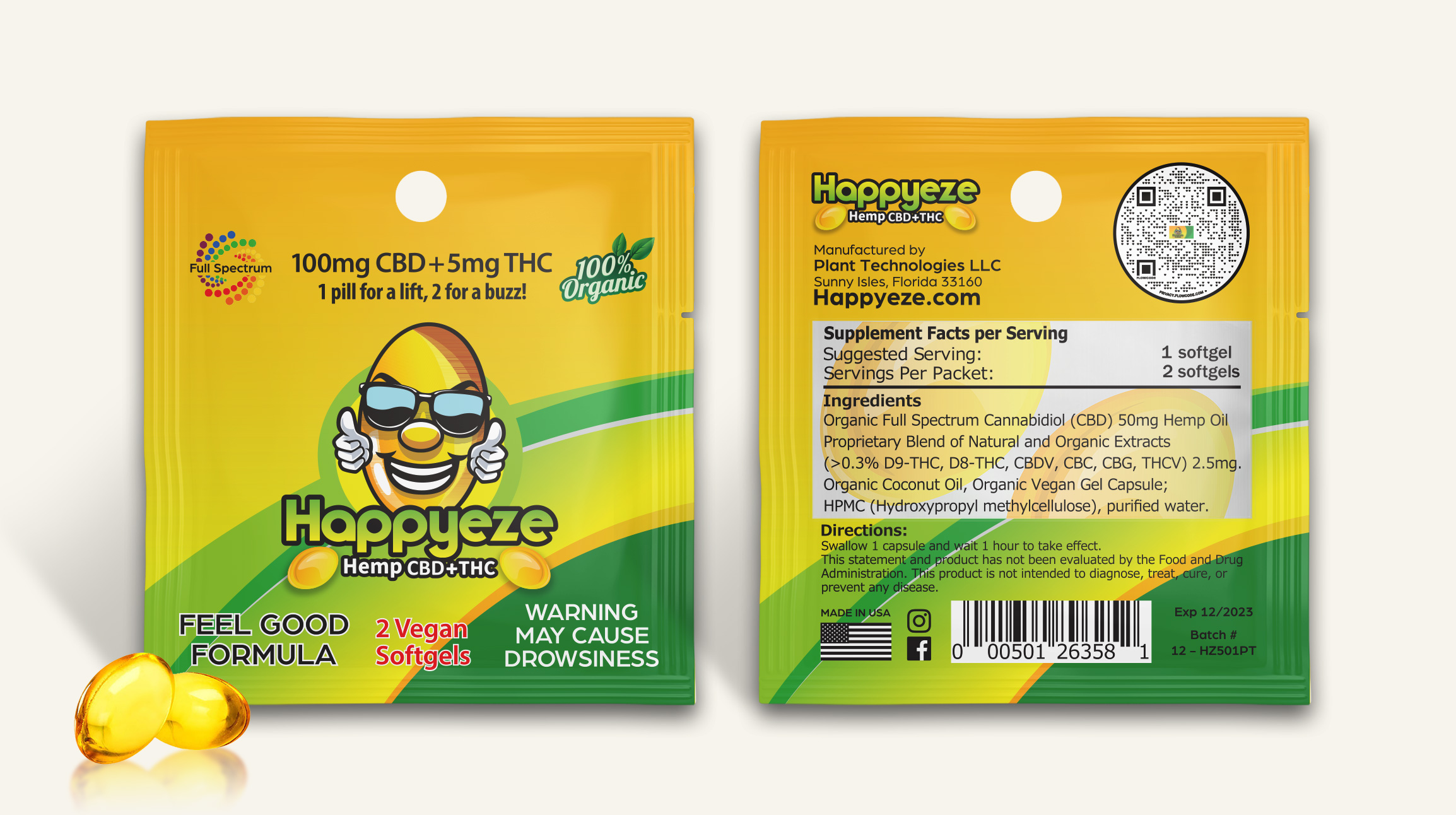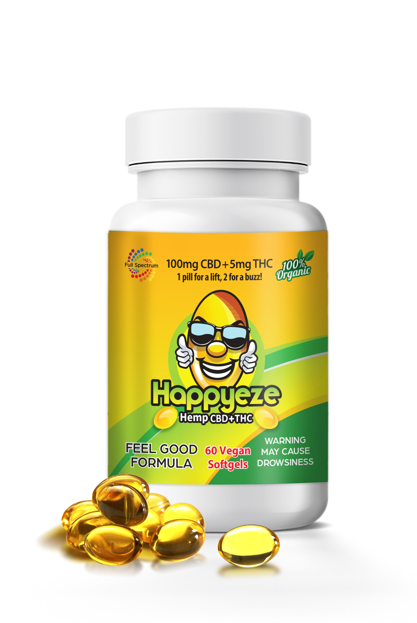 Offered in a 2-pill packet, or 60-pill bottle. Happyeze contains 50mg of full-spectrum CBD oil along with 2.5mg of Delta 8 THC, plus a special mood-enhancing herbal blend in each soft gel. Lab tested and 2018 Farm Bill Approved, these pills contain less than 0.3% delta 9 THC.